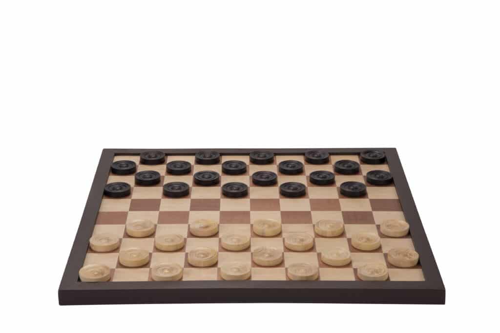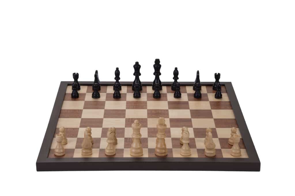 Tweezijdig schaak-/dambord ingelegd gemaakt van hout (walnoot en essen) en geleverd in colourbox. Het schaakbord bevat 8x8 velden, het dambord bevat 10x10 velden. Dit artikel bevat geen schaak-/ damstukken. Het bord heeft een opstaande rand.