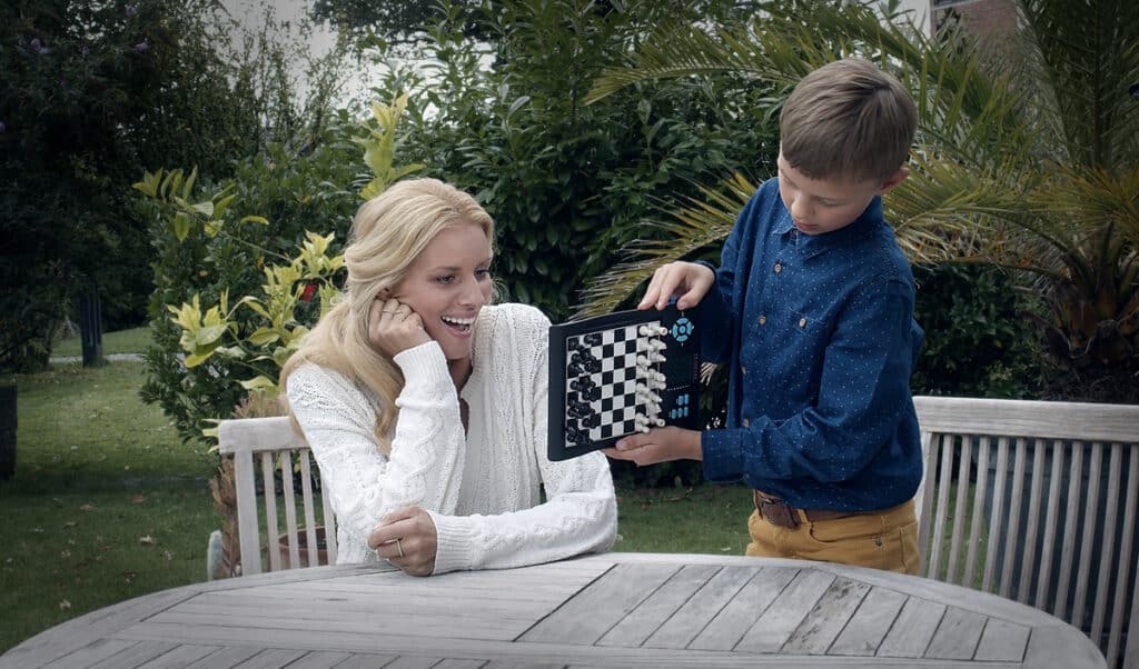 Nog geen idee dus. Pluspunt is dat er meerdere spellen op gespeeld kunnen worden en de echte schaakstukken vindt kleinzoon ook wel heel fijn.
