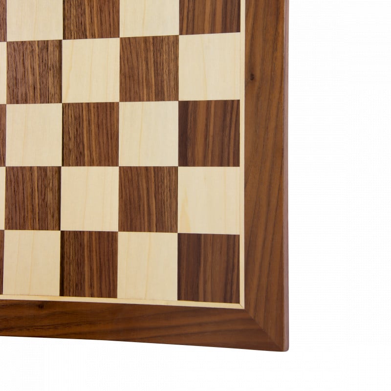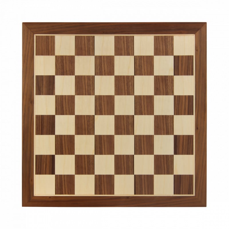Dit houten schaakbord Walnoot / Esdoorn heeft een afmeting van 54 x 54 cm. Aan de rand zitten geen coördinaten. Veldmaat is 58 mm.