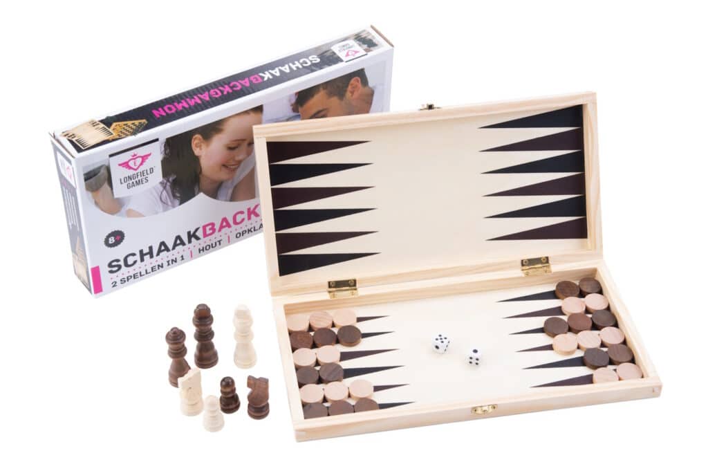 Schaak/ backgammon set gemaakt van berkenhout. De set is inklapbaar en wordt geleverd in een colourbox. Aan de buitenkant van het spel kun je schaken, aan de binnenkant kun je backgammon spelen. Het spel wordt geleverd inclusief de benodigde schaakstukken, backgammonstenen en dobbelstenen. Ook wordt er een handleiding meegeleverd met de spelregens van zowel schaken als backgammon.