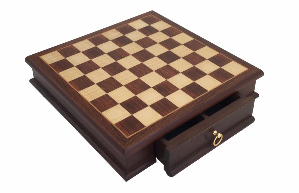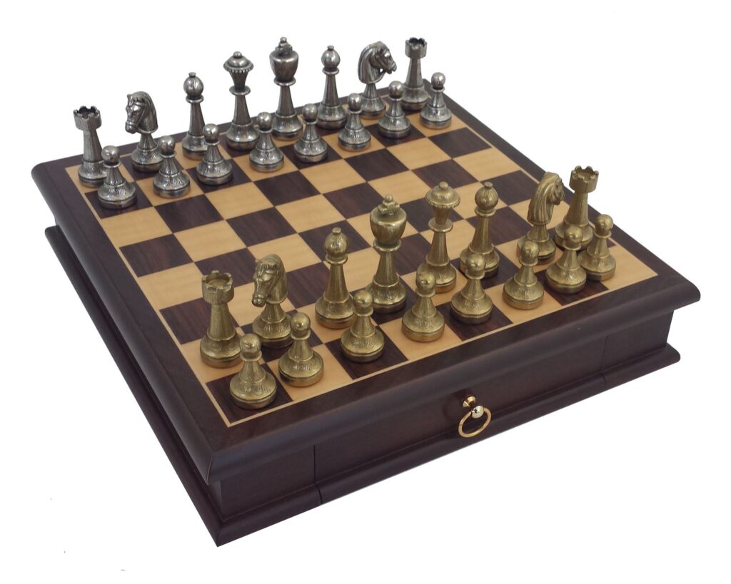 De schaakstukken zijn gemaakt van massief metaal en met de hand afgewerkt voor een ongekende glans en detailniveau. Het bord zelf is een kunstwerk van kostbaar rozenhout, waarbij elk speelveld met de hand is ingelegd (inlaid). Dankzij de geïntegreerde lade kunt u de zware metalen stukken na het spel veilig en stijlvol opbergen.