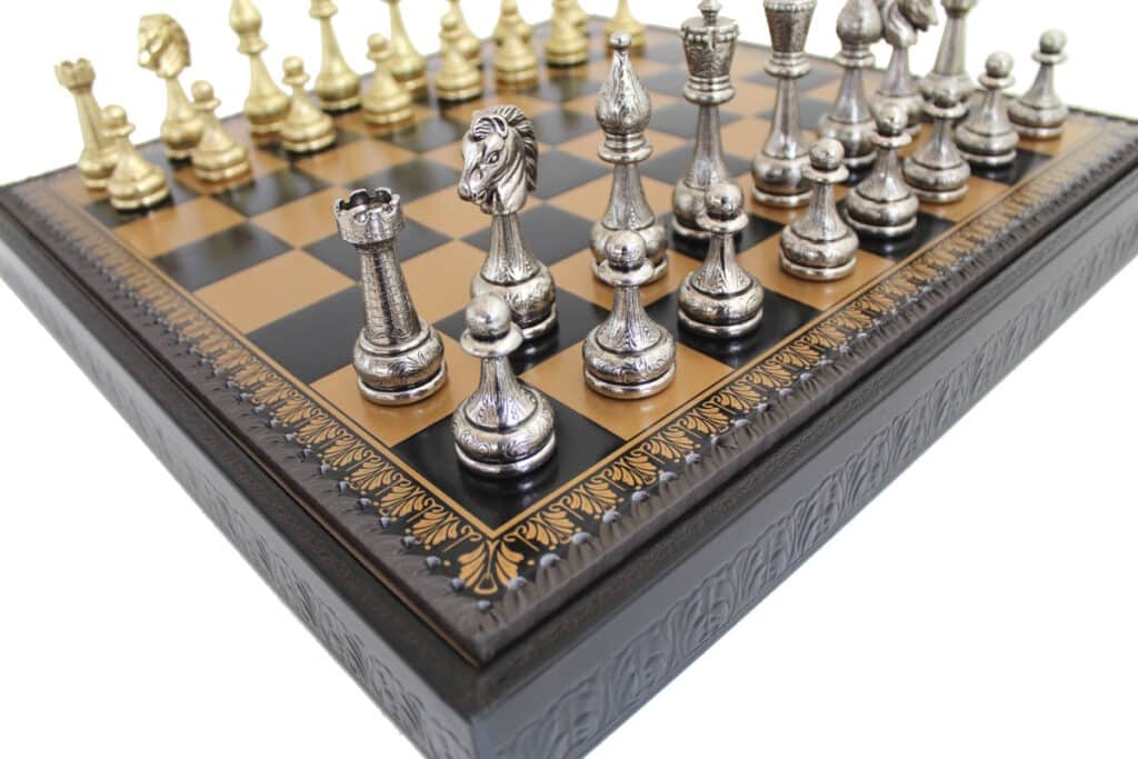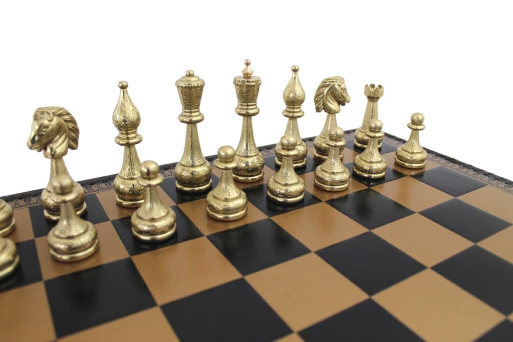 Metal chess pieces + Gold/black leatherette chessboard box. Deze schaakset bestaat uit metalen schaakstukken en een goud/zwart schaakbord van kunstleer. In de schaakbord-doos kun je de stukken opbergen. Ook zitten er damstenen en dobbelstenen in de doos. Hiermee kun je dammen of backgammon spelen. Backgammon kan worden gespeeld op de achterkant van het schaakbord.