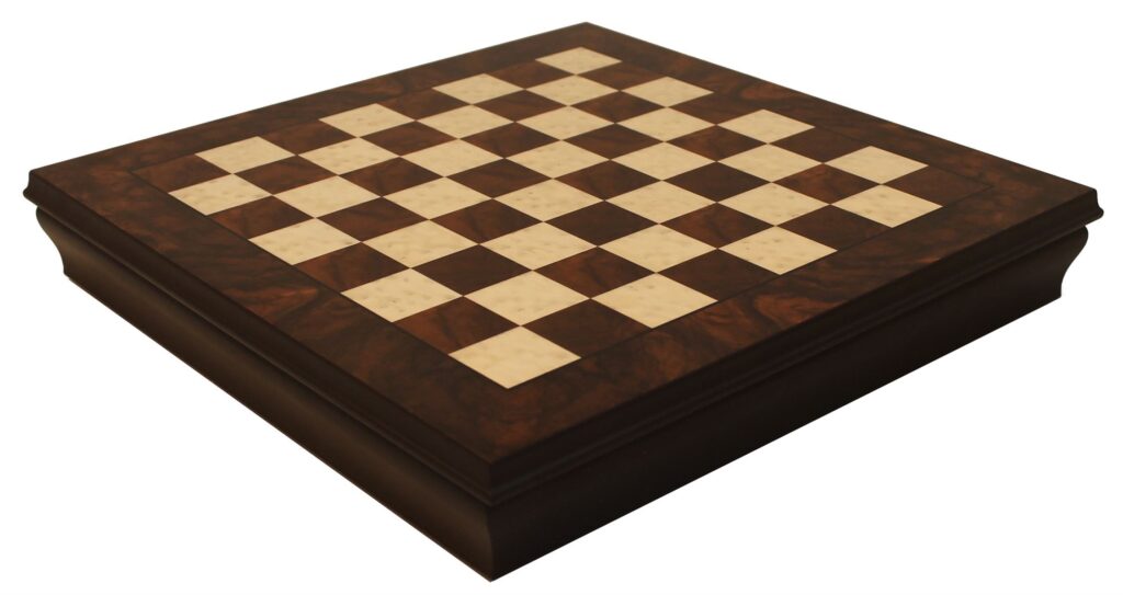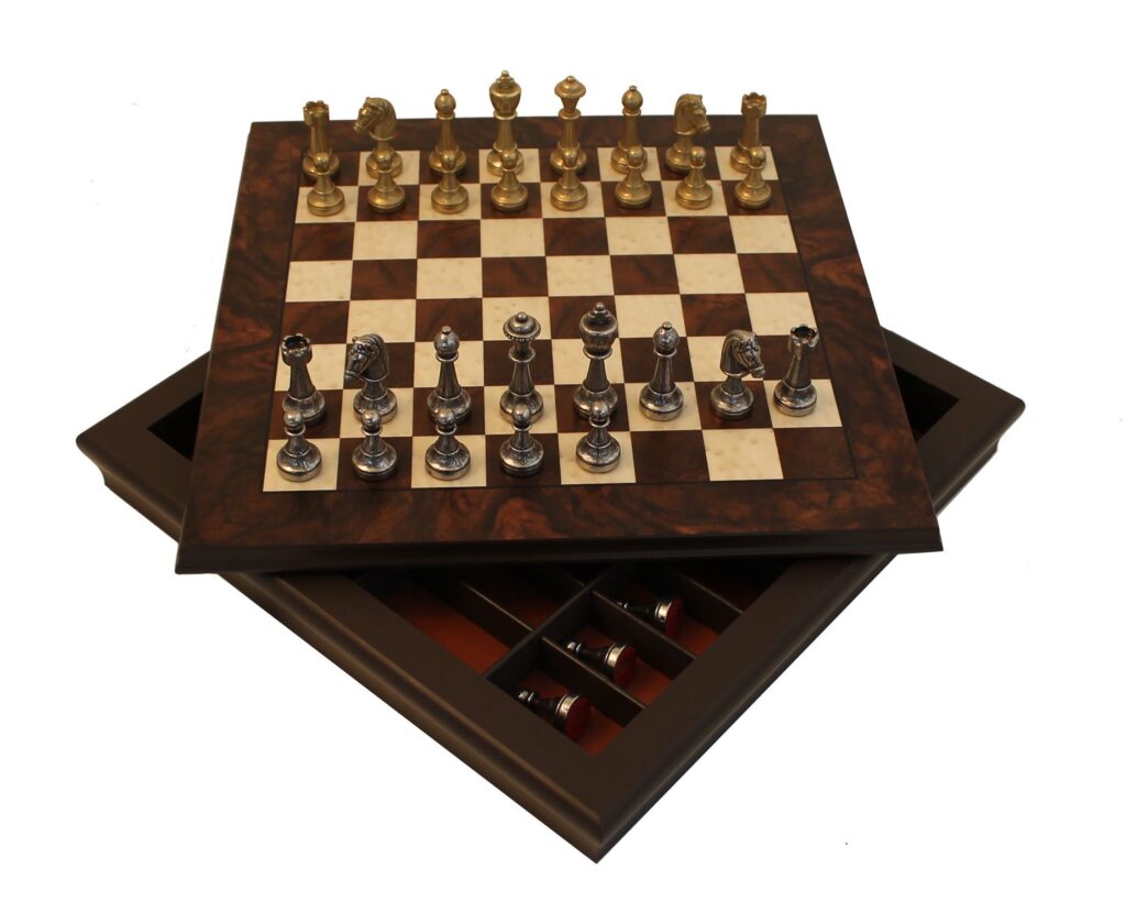 De schaakstukken zijn vervaardigd uit massief metaal en met de hand gepolijst voor een ongekende glans en een luxueus zwaar gewicht. Het bord is gemaakt van Briar Walnut (wortelnotenhout), bekend om zijn complexe en unieke nerfvlammen. Het speelveld is met de hand ingelegd (inlaid) en onder het bord bevindt zich een geïntegreerd opbergcompartiment om de kostbare stukken veilig te bewaren.
