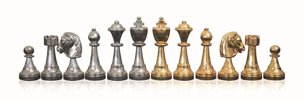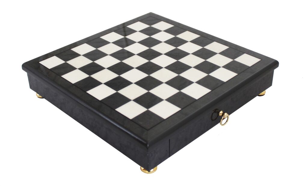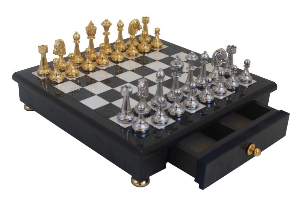 Deze prestigieuze Italiaanse schaakset schittert met massief metalen speelstukken die met de hand zijn afgewerkt in goud- en zilverplatering. Het bijbehorende bord van grijs wortelesdoorn heeft een hoogglans afwerking, een handige opberglade en elegante voetjes, wat het geheel tot een sieraad in elk interieur maakt.