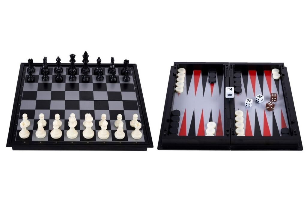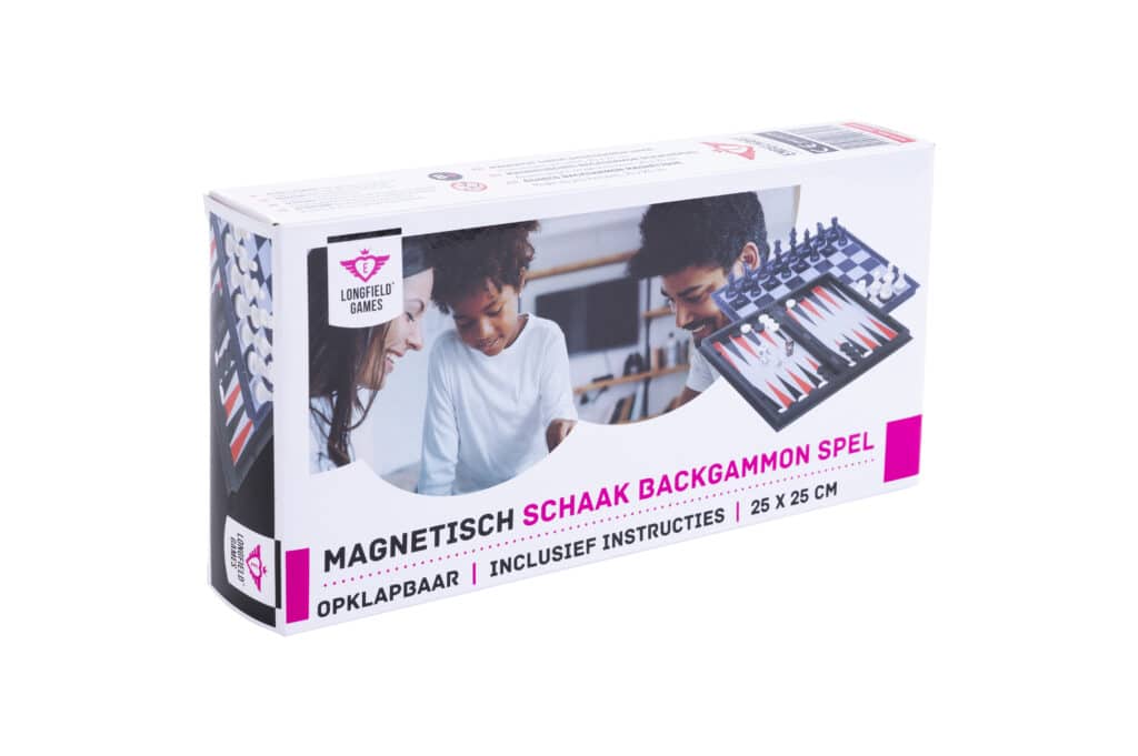 Dit reis schaak/ backgammonbord is magnetisch, opklapbaar en bevat een opberg compartiment. Het spel wordt geleverd in een colourbox. Door het compacte formaat is het spel ideaal om mee te nemen op reis. Ook berg je het thuis gemakkelijk op. Doordat de stukken magnetisch zijn, blijven ze steviger op het bord staan. Het spel wordt geleverd met schaakstukken, backgammonstenen en dobbelstenen.
