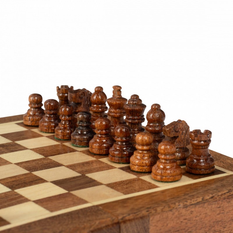 Dit schaakspel is ingelegd en gemaakt van acaciahout. De stukken zijn magnetisch. Het bord kan ingeklapt worden en in de binnenkant is ruimte om de stukken op te bergen. Hierdoor is dit schaakspel ideaal om mee te nemen en onderweg mee te spelen. Door de sluiting blijft het bord tijdens transport goed dicht zitten. De set wordt geleverd met een fluwelen etui. Hierin kun je het spel overal mee naartoe nemen.