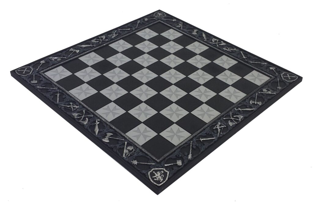 Beleef het tijdperk van ridders en kruisvaarders met dit karaktervolle "Crusaders Style" schaakbord. Dit bord is vervaardigd uit zwaar en duurzaam resin (kunsthars), wat het een authentieke, bijna stenen uitstraling geeft. De randen en velden zijn voorzien van verfijnde details die doen denken aan de architectuur van middeleeuwse burchten en vestigingen.