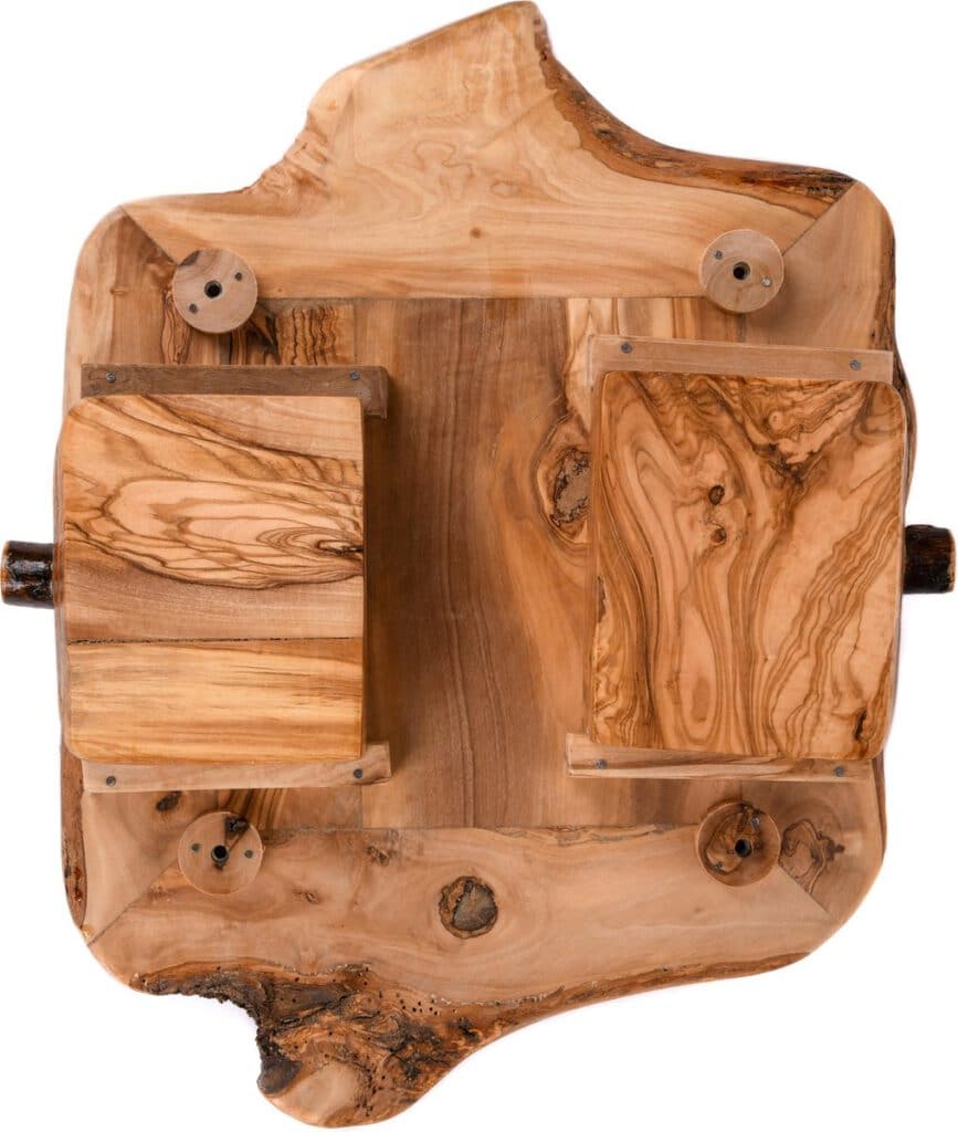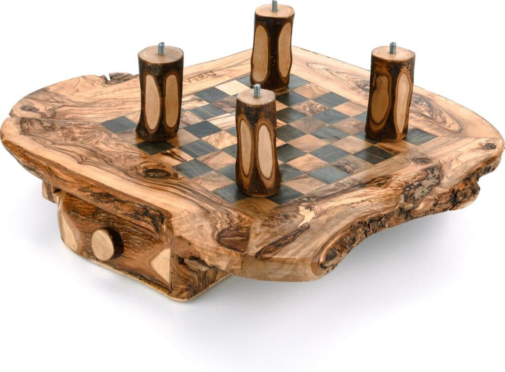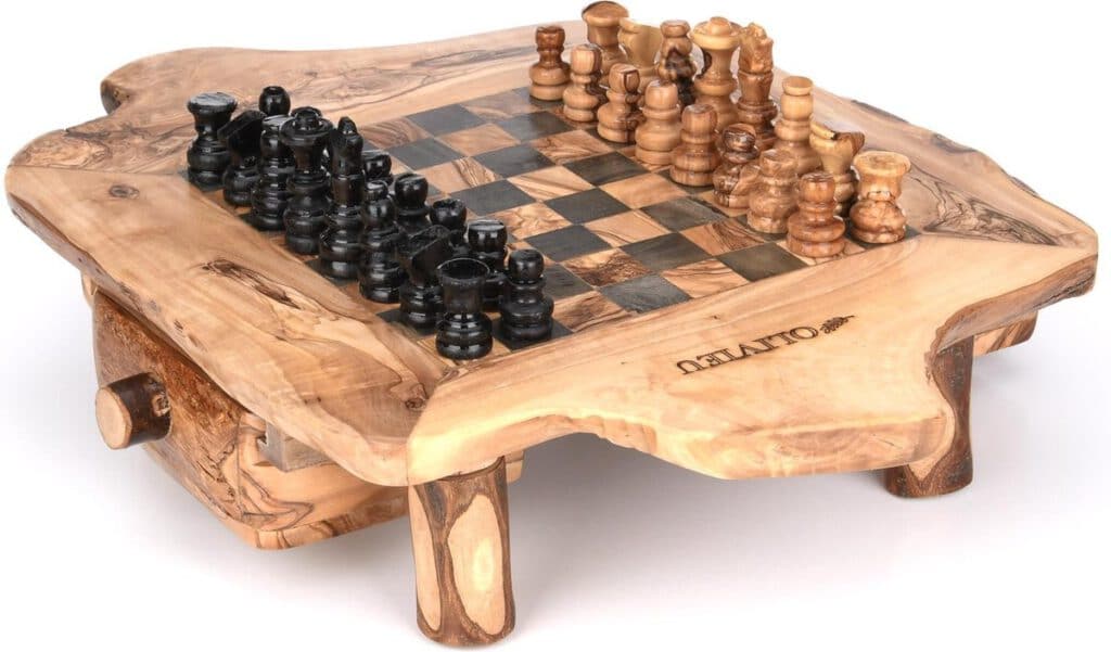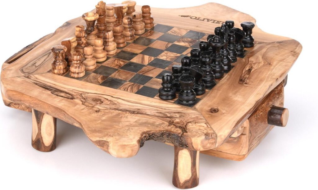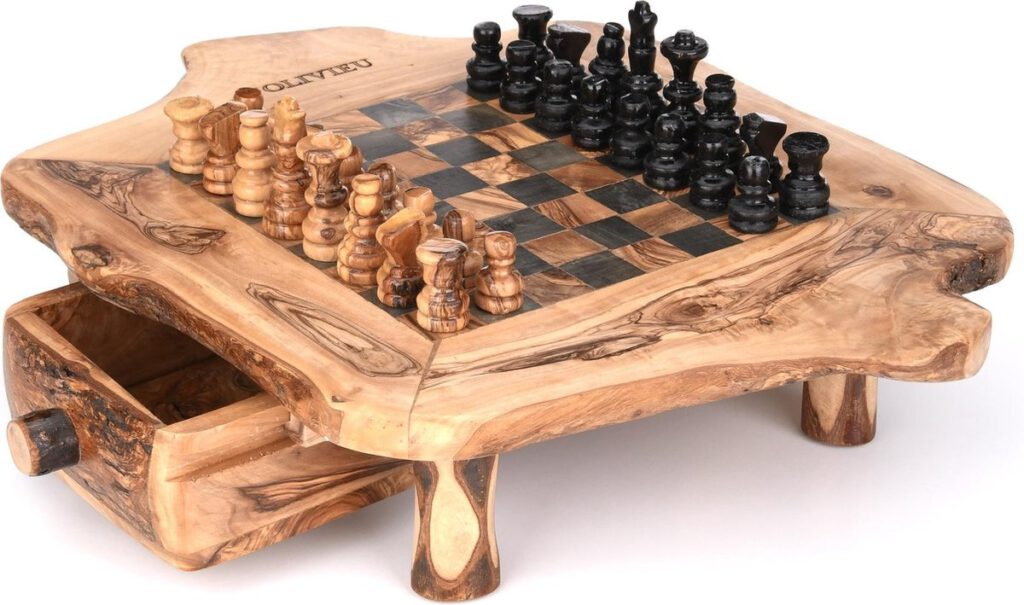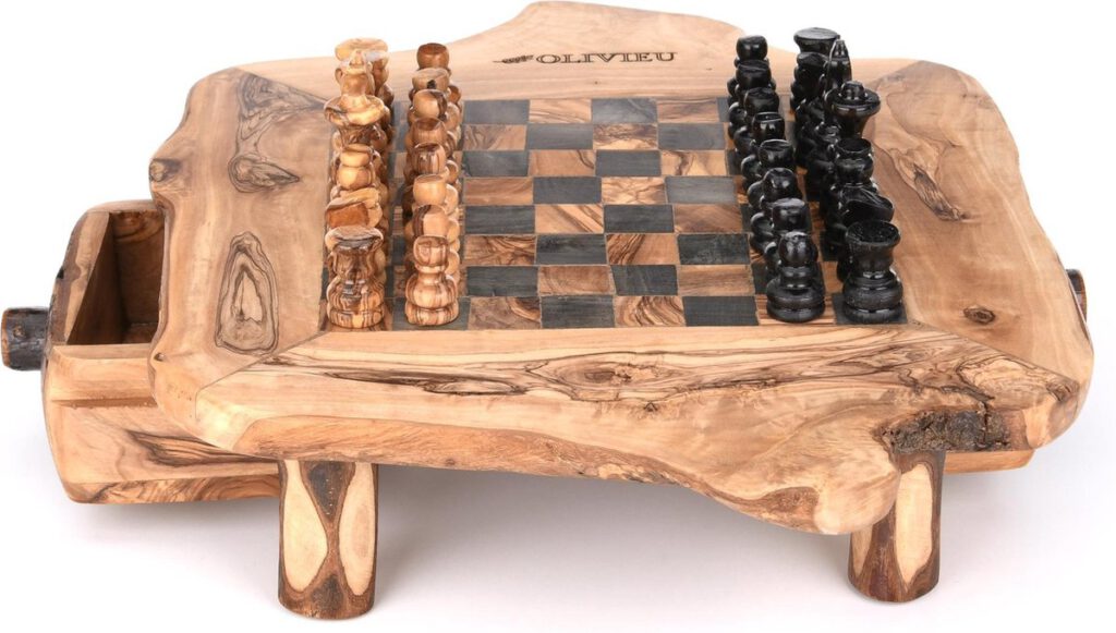 Het design van het Schaakbord is gemaakt om uw schaakstukken te kunnen opbergen in de lades. Ook kunt u de pootjes van het schaakbord losschroeven. Hierdoor kan het schaakbord veilig en onbeschadigd naar uw adres verzonden worden. De unieke olijfhout nerven van het schaakbord kunnen uw creativiteit bevorderen.