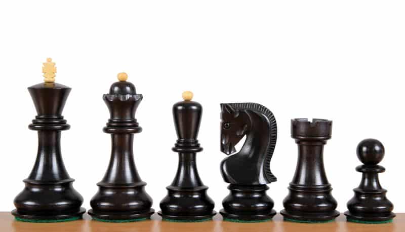 Deze prachtige set schaakstukken wordt geleverd met twee extra dames (wit en zwart). De stukken in deze set zijn erg specifiek, vooral de Koning, Koningin en Loper. Het Paard is gemaakt in Russische stijl (let op het nauwkeurig gesneden hoofd, waarvan de uniciteit wordt benadrukt door de gesloten, slanke mond die gebogen is over een dikke nek).
